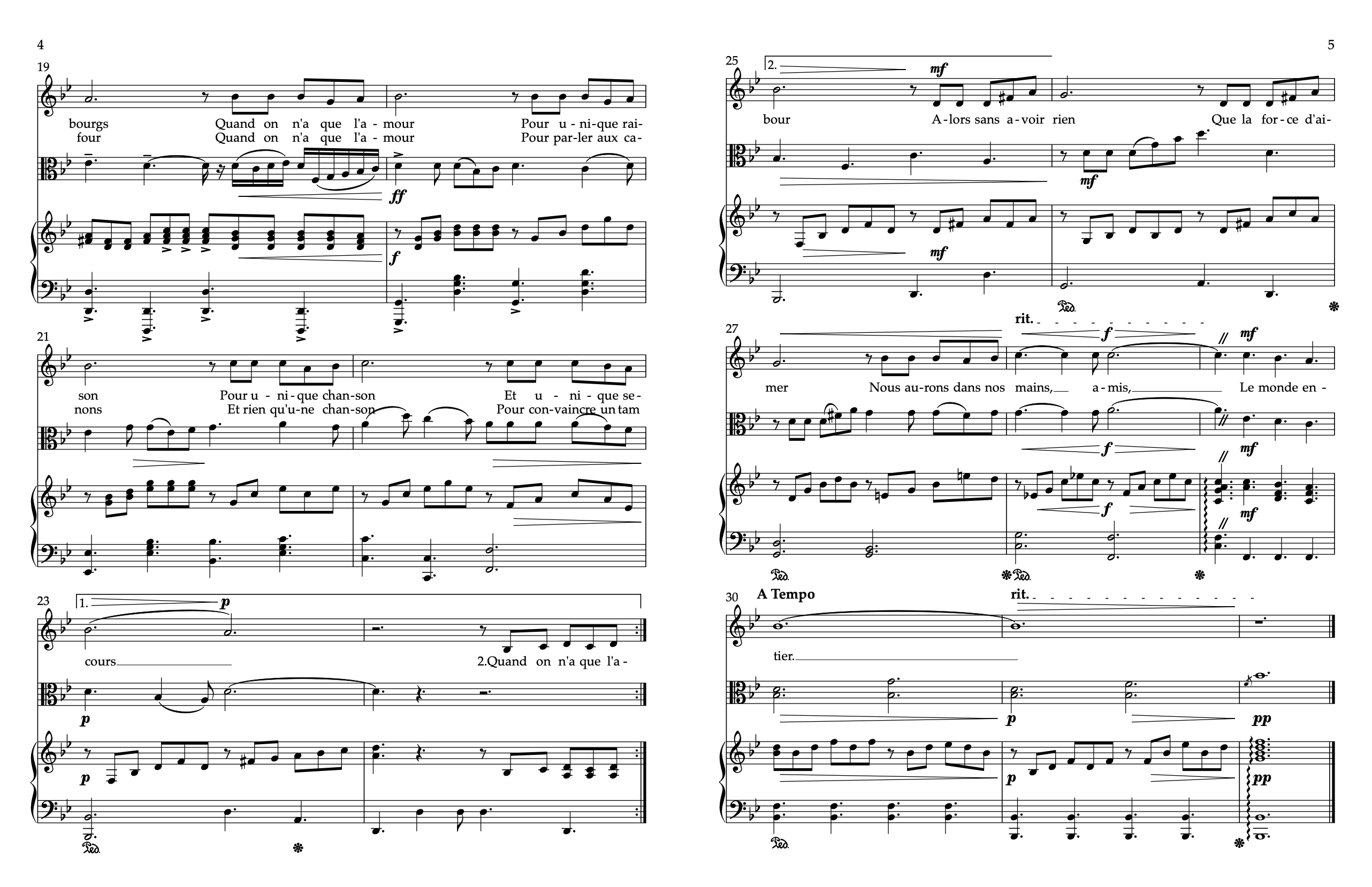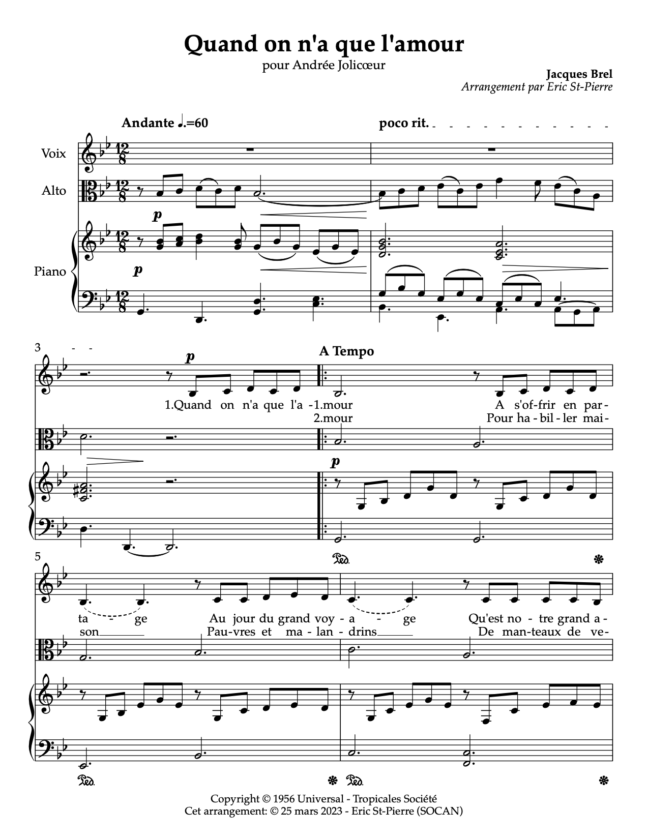 Un arrangement de la chanson de Brel, pour Mme Andrée Jolicoeur, avec accompagnement d'alto et de piano.